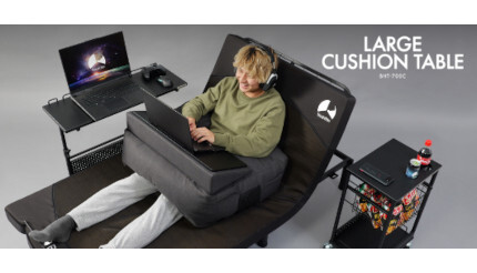 「ラージクッションテーブル BHT-700C」は、ゲーミングノートPCの操作を部屋中どこでも好きなところで可能にする、テーブル天板付きの膝上クッション。