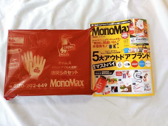 宝島社から6月9日に発売された『MonoMax(モノマックス)7月号』の付録は、チャムスとコラボした「防災5点セット」です。