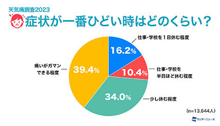 天気痛の痛みが最もひどい時は、どの程度かを尋ねた質問では、4人に1人が「仕事・学校を半日休む程度」または「仕事・学校を1日休む程度」と答えている。「少し休む程度」を合わせると、6割超が我慢できないほどの症状があるという。