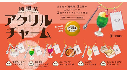 ケンエレファントは、純喫茶にまつわる書籍を多数執筆している難波里奈氏と共同開発したカプセルトイ「純喫茶アクリルチャーム」を6月下旬に発売する。全6種類で、価格は1個400円。