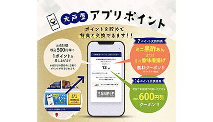 また、5月18日からは、大戸屋公式アプリでそれまで提供していたアプリ版スタンプカードの後継となる「アプリポイント」の運用を開始している。スタンプカードからポイント付与型に移行し、税込500円利用ごとに1ポイントを付与。7ポイントまたは14ポイント貯まったら、特典クーポンと引き換えることができる。