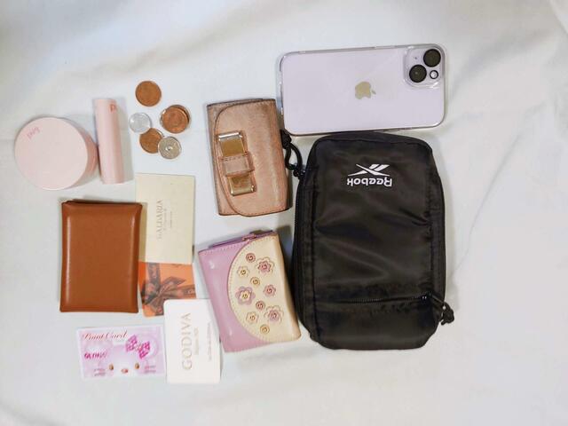 「カード4枚、小銭、ファンデーション、ミニ財布、リップ、キーケース、携帯、名刺入れ」
