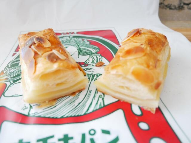 全長約17㎝の長方形型のアップルパイには、スライスしたりんごがたっぷりとパイ生地の中にサンドされていて、表面にはスライスアーモンドがトッピングされています。
