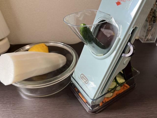 しかし、きゅうりは軽く、野菜の重さだけでは中々カットできず、左手できゅうりを押してあげる必要がありました。