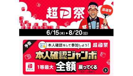 PayPayは6月15日~8月20日まで、マイナンバーカードや運転免許証のICチップなどで本人確認を実施したユーザーを対象に「超PayPay祭(ちょうペイペイまつり)」を開催する。