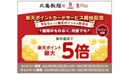 期間中にエントリーの上、丸亀製麺の店舗で税込100円以上の会計時に、楽天ポイントカードまたは楽天ポイントカード機能を搭載したアプリを提示すると、特典ポイントとして通常の2倍、「楽天ペイ」アプリ内の楽天ポイントカードを提示した場合は通常の5倍の楽天ポイントが付与される。