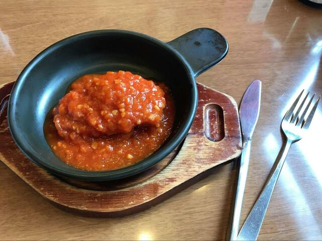 食欲が刺激されるビジュアルです。湯気と共にガーリックとトマトの香りが漂ってきて、これだけでご飯一杯食べられそう。