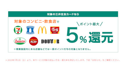三井住友カードは、対象の三井住友カードの特典「対象のコンビニ・飲食店で最大5%還元!」について、7月1日利用分からサービス対象の支払方法・還元率を改定し、「最大7%」にポイント還元率を引き上げる。