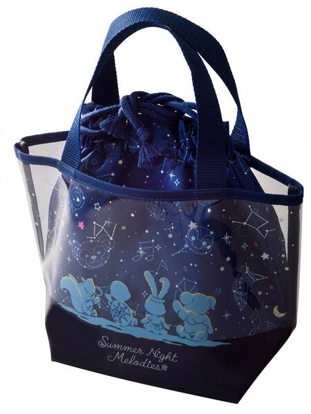 スーベニアランチケースは、夏の夜に星空を見上げているダッフィー、ステラ・ルー、オル・メル、リーナ・ベルの後ろ姿をデザイン。