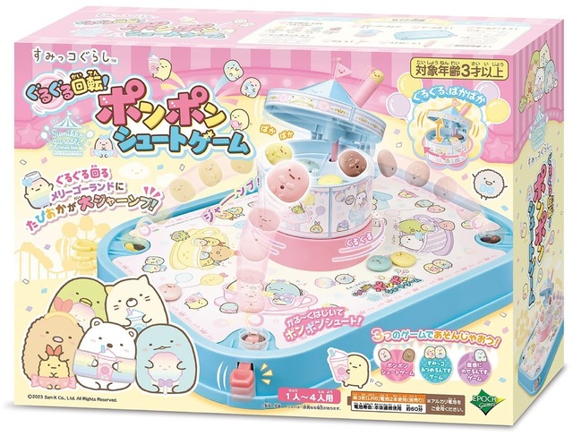 アクション・トイ部門の優秀賞に選ばれた「すみっコぐらし ぐるぐる回転!ポンポンシュート」は、すみっコぐらしのたぴおか型の玉を飛ばして、ゲーム台中央に設置されたメリーゴーランドへ入れる卓上の玉入れ遊びゲームです。