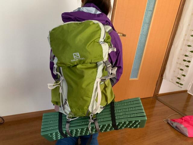 リュックサックにマットをセットしてみましたが、とても軽いのでつけていても楽です。