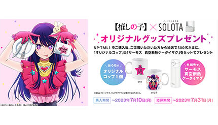 パナソニックは6月15日に、同社の食器洗い乾燥機「NP-TML1」を対象期間中に購入して、指定の期間までに応募した人を対象に、「オリジナルコップ」と「サーモス 真空断熱ケータイマグ」のセットをプレゼントする「【推しの子】×SOLOTAオリジナルグッズプレゼントキャンペーン」を開始している。