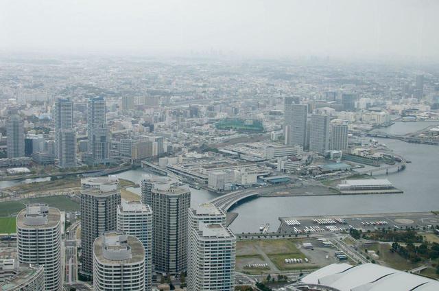 横浜駅方面。雲の彼方にかすんでいるのは、川崎市の高層ビル群ですかね。