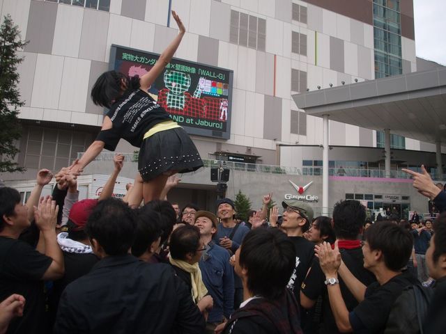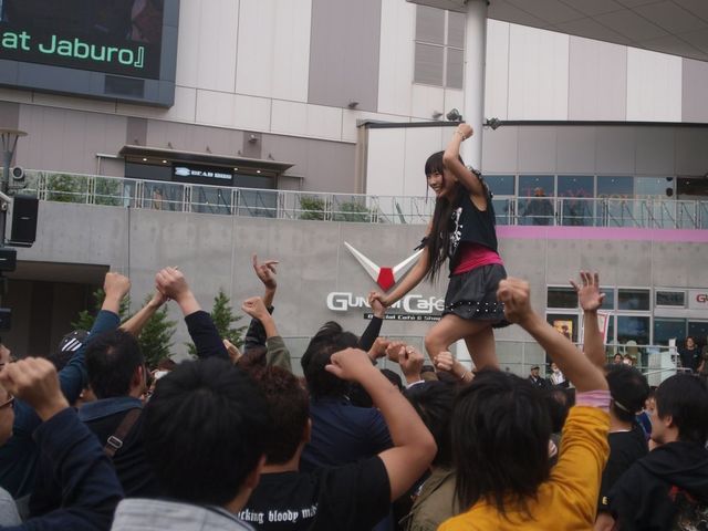 そこを行くと、晴子さんはもう完全に手慣れたというか足慣れたというか(笑)、どんどん先に行っちゃうんですよ!ファンの方も一回支えたら先の方にダッシュしてまた支えるんですよ…。文字通りアイドルを支えるファンですよ!曲が終わったのにそのままガンダムの足もとまで行ってて爆笑しましたよ!