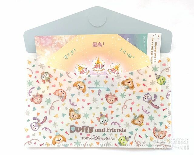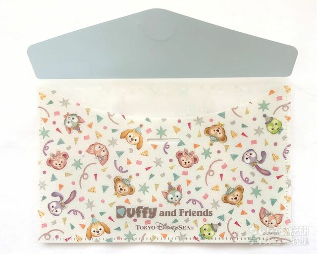 表:淡いピンクベージュとピンクのホルダーの表に、クリアな外ポケットが付いており、その部分に第1弾のダッフィーたちを丸く配置。