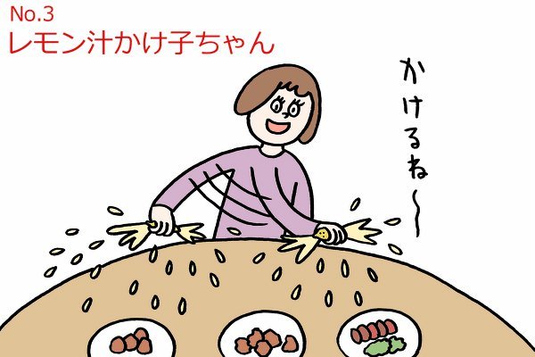 気配りをしてみんなの役に立ちたいけど少し空回りして、からあげをビチャビチャにしてしまうのは”レモン汁かけ子ちゃん”。