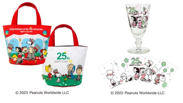 左:【銀座三越限定】<スヌーピータウンショップ> 丸ミニトートバッグ 1,980円 (約W(上部)22.5×H16×丸底直径14cm)、右:【銀座三越限定】<スヌーピータウンショップ> 記念パーティーグラス 1,760円 (約直径6.9×H12.9cm) © 2023 Peanuts Worldwide LLC