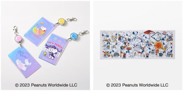 左:【銀座三越限定】リール付きオーロラパスケース 各2,420円 (全3種/約W7.2×H11.6cm)、右:【銀座三越限定】手ぬぐい 3,300円 (約W90×H33cm) © 2023 Peanuts Worldwide LLC