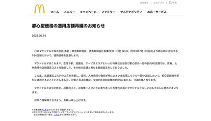 日本マクドナルドは7月19日から、都心部に立地する「マクドナルド」184店舗において、適用価格を見直す。