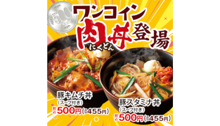 安楽亭は、焼肉レストラン「安楽亭」でランチタイム限定で500円で楽しめる「ワンコイン肉丼」として「豚キムチ丼」と「豚スタミナ丼」の販売を6月23日に開始した。
