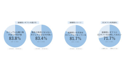 結婚祝いギフト選びについて尋ねた質問では、「カジュアルな贈り物のほうが気が楽」(83.8%)、「相手の負担にならないカジュアルなものがよい」(83.4%)といった、カジュアルな結婚祝いギフトの利用意向が高いことが明らかになっている。また、「結婚祝いの方法はカジュアルになっている」と実感している人が8割超を占めた。結婚祝いギフトの購入方法や贈る手段としては、ECギフトの利用意向が71.7%に達している。