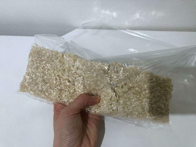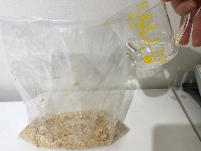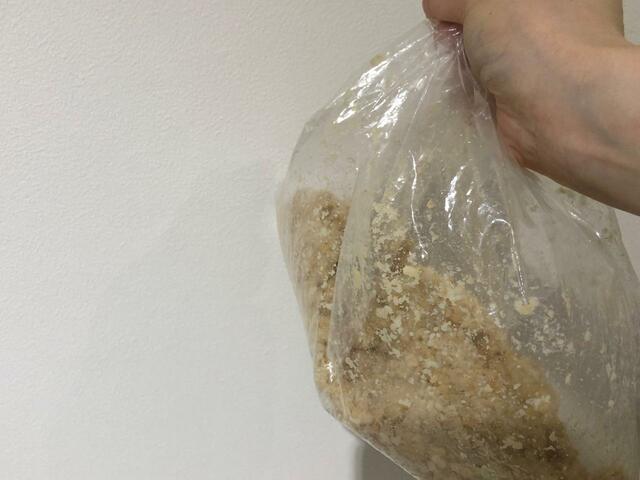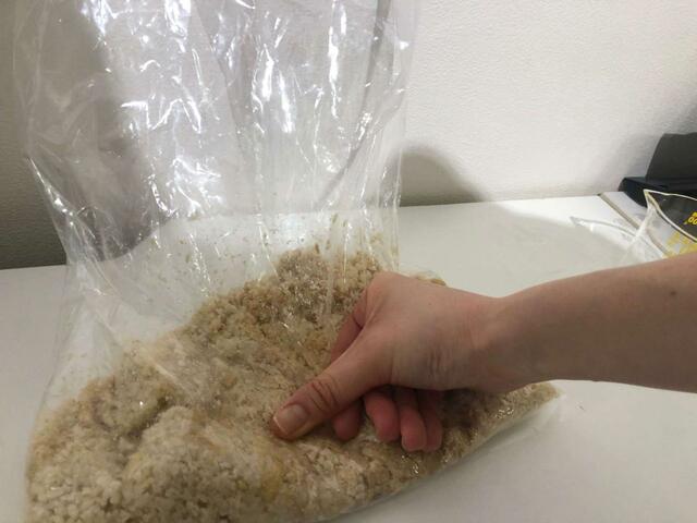 下準備が終わったら塩入生米麹をほぐしていきます。かたまりの状態で入っているので、袋の上からほぐしてさらさらにします。