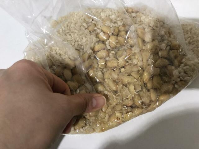 煮大豆と米麹を袋の上から揉むように丁寧に潰し、できるだけ大豆がぺったんこになるように力を入れて潰しましょう。だんだん大豆と麹が混ざってきます。