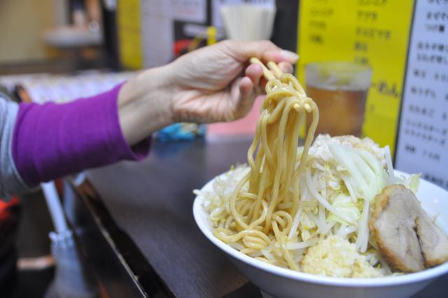 麺は店の奥の倉庫で作っている自家製麺だ。金田店長は二郎のような極太麺が好みだが、麺との味の絡み具合や食べやすさを考え、極太まではいかない太麺にしたそうだ。