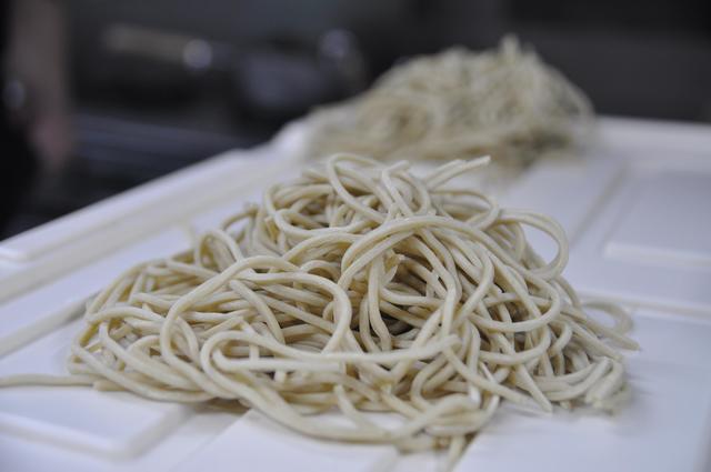 「粉はオーションですか?」と、すかさず千葉。これは、二郎と同じで100%オーション(日清製粉の強力粉)であった。製麺機でミキサーされ生地は食感を良くするために、一晩ねかせてなじませ、裁断機で切ってようやくでき上がる。