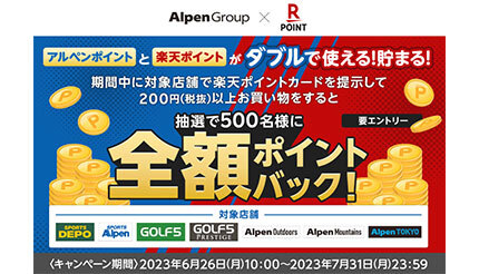期間中にエントリーのうえ、アルペングループの対象店舗で楽天ポイントカードを提示して税別200円以上の買い物をすると、抽選で500人に、1万ポイントを上限として買い物金額を全額ポイントバックする。よって当選した場合、1万円以下の買物なら実質無料となる。