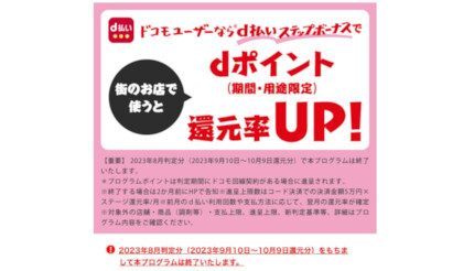 NTTドコモは、2021年9月1日に開始したドコモ回線契約者向け優遇プログラム「ドコモユーザー限定!d払いステップボーナスプログラム」を23年8月判定分で終了する。
