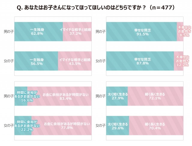 ママたちは、男の子も女の子にかかわらず「イマイチな相手と結婚」するよりは「一生独身」、「不幸せなお金持ち」よりは「幸せな貧乏」、「時間に余裕があるがお金がない」よりは「お金に余裕があるが時間がない」、「太く短く生きる」よりは「細く長く生きる」を希望しているという結果に。