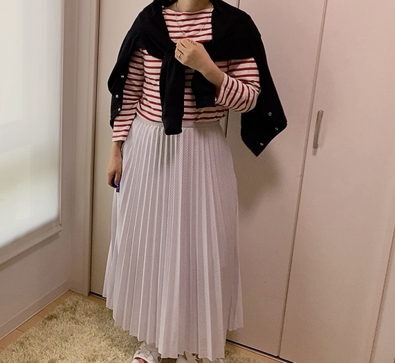 今回購入したライトグレーのアクティブプリーツスカートは、赤や緑など明るいアイテムとの相性が良さそうです。