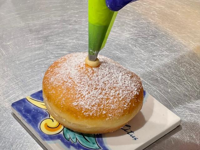 【Litus】 ボンボローニの横からクリームをつめて渡してくれる。テイクアウトも可能だ