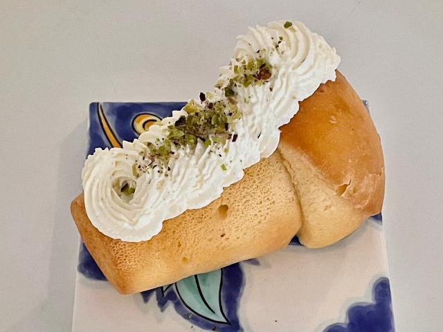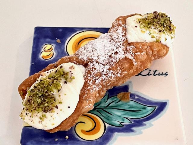 カンノーリは小さな筒という意味。朝揚げた筒状の生地に、注文ごとにイタリア産リコッタチーズのクリームをつめ、シチリアはブロンテ産ピスタチオを添えて渡してくれる。