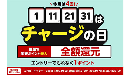 楽天Edyは、「1日・11日・21日・31日はチャージの日! 抽選で楽天ポイント最大全額還元!」キャンペーンを7月も実施する。7月の対象日は、1日・11日・21日・31日の4日。