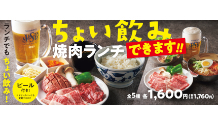 ワタミは7月3日から、「焼肉の和民」で毎日20時以降に販売している「パーフェクトサントリービール」付き焼肉定食セット5種を、ランチタイム(11時~16時)にも「ちょい飲み焼肉ランチ」として販売する。価格はいずれも1760円。