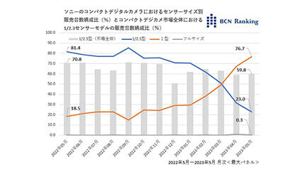 最も大きな変化はセンサーサイズの構成比に表れている。ソニーのコンパクトデジカメは、昨年5月の段階で1/2.3インチセンサー搭載モデルが販売台数の81.4%。比較的低価格なモデルが大半を占めていた。平均単価(税抜き、以下同)が1万5000円前後のCyber-shot W830を筆頭に、3万5000円前後のCyber-shot WX500などが売れ筋だった。しかし、この5月にはこれらの1/2.3インチのセンサー搭載モデルは23.0%まで縮小。逆に平均単価8万6000円前後のVLOGCAM ZV-1や同15万5000円前後のCyber-shot RX100 VIIなど、比較的高価な1インチセンサー搭載モデルが76.5%を占めるまでに拡大した。