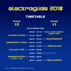 出演者のJAMES BLAKE、!!!、SHERWOOD & PINCH、MACHINEDRUM、NOSAJ THINGの楽曲はもちろん、2000年の初開催以降に出演したUNDERWORLD、ORBITAL、FLYING LOTUS、SQUAREPUSHER、LFO、DJ KENTAROなど、これまでにelectraglideのラインナップを彩ってきたアーティストの代表曲が収録されたコンピレーション『electraglide 2000-2013』。