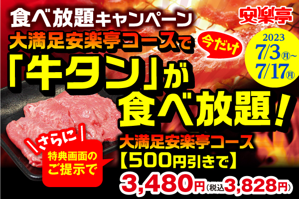 焼肉レストラン「安楽亭」では2023年7月3日(月)から7月17日(月・祝)まで、「牛タン」が期間限定で食べ放題となるキャンペーンを開催しています。