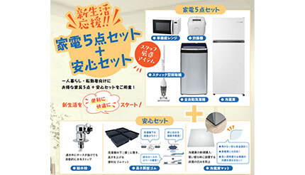 「新生活応援!家電セット」では、新たに一人暮らしを始める学生や社会人、転勤者が、よりお得で快適な新生活をスムーズにスタートするための家電必需品5点セットとして、冷蔵庫(120-150L)、全自動洗濯機(4.5-5.5L)、スティック型掃除機、単機能レンジ(15-20L)、炊飯器(3-4合)を同社スタッフが厳選し、用意した。