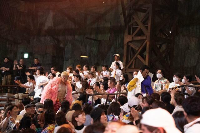 キャストが客席後方からステージまで客席間を縦に駆け抜けるシーンなど、通路沿いのゲストには麦わらの一味や出演者が触れ合いに来てくれることがあります。