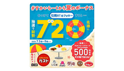 すかいらーくグループは、総勢720人に500円分の食事券が当たるキャンペーンを実施している。期間は7月9日まで。