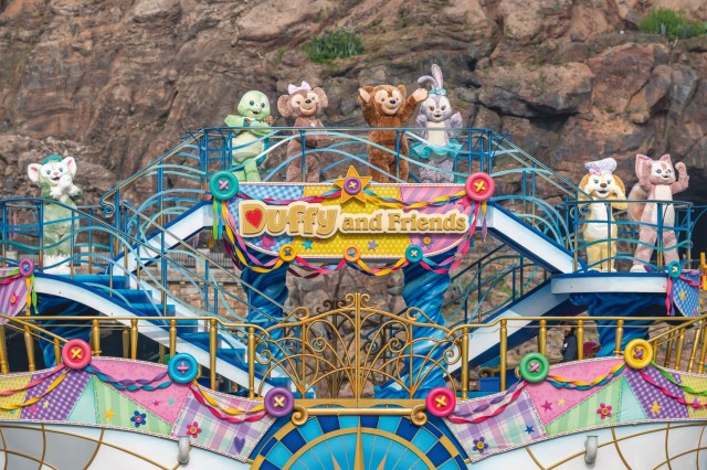 船の進行方向先頭には、初登場3人組、真ん中の高いところにダッフィーとメイちゃん、後ろにジェラトーニとルーちゃんが乗っています。