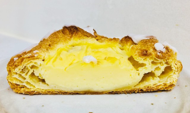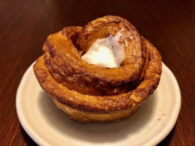 小さいときから食べていたパン屋「アンデルセン」にもあるカスタードデニッシュ。こちらも定番のペストリーで、カスタードクリームはぺったりとしたプリンっぽい食感。やはりイエンセンさんの生地は独特の口どけですね。アイシングも適量で美味しい。