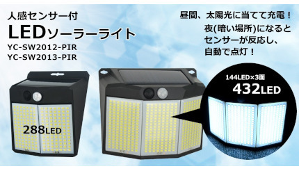 センター商事は7月に、「432LEDソーラーライト YC-SW2013-PIR」「288LEDソーラーライト YC-SW2012-PIR」を発売した。Yahoo! ショッピングでの価格は、「432LEDソーラーライト YC-SW2013-PIR」が2080円、「288LEDソーラーライト YC-SW2012-PIR」が1980円。