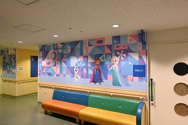 外来待合室の廊下には、ディズニーのイラストが描かれた壁紙が貼られました。