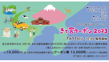 富士宮市観光協会は、富士宮市内の観光支援プロジェクトとして「きて宮クーポン 2023」の販売を7月11日に開始する。