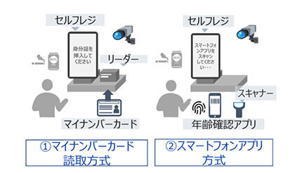 酒類・たばこなど、販売時に年齢確認が必要な商品のマイナンバーカードを使った年齢確認の検証では、マイナンバーカードの読み取りと、スマートフォン(スマホ)アプリで事前にマイナンバーカード情報を読み取り、店舗決済時にマイナンバーカードを使用せず事前登録したスマホアプリをかざして年齢認証を行う方式の2通りを想定しており、スマホアプリを中心に導入を想定しているという。実証実験を通じ、店内防犯カメラにて運用面の課題などを検証する。