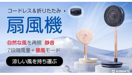 シン(金三つ)三海は7月10日に、同社の運営する「AFU(アフー)ストア」が、コードレス&折りたたみ扇風機「AIRMATE」(RD20)の販売を応援購入サービス「Makuake」にて開始したことを発表した。カラーは、ブルー、ピンクの2色。通常販売価格は1万5200円で、「Makuake」での価格は9580円(超超早割)から。販売期間は8月28日18時まで。